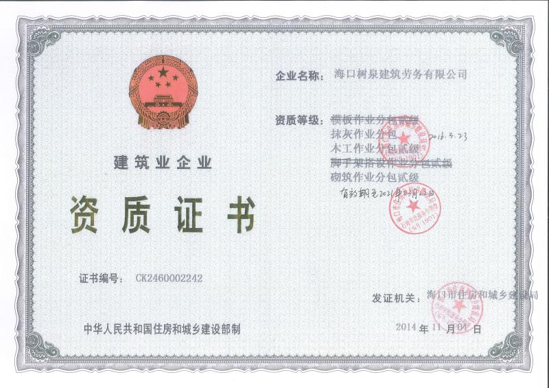 海口樹泉建筑勞務有限公司成立于2011年,公司位于海口,其前身是一家專業(yè)建筑施工隊,自2004年即開始在海南從事建筑勞務施工。自成立至今,公司已經(jīng)擁有一支科學管理、質量過硬、能打硬仗,搶工期的專業(yè)隊伍。能獨立承擔大中型工業(yè)與民用建筑 、室內外裝修、各類機電設備安裝工程。代表工程有海口濱海華庭、三亞時代海岸T01/02/04/05棟高層、合肥東海花園二期、陵水富力灣B區(qū)高層、三亞金中海(酒店)、瓊海大印經(jīng)典花園、海口環(huán)球海景大酒店(四星級酒店,在建中)、陵水珍珠大廈(五星酒店)、海口萬達廣場、美蘭機場二期。
